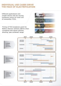 Σύμφωνα με μελέτη του “McKinsey Center for Future Mobility” οι αναμενόμενοι ρυθμοί εξέλιξης στο θέμα του εξηλεκτρισμού των οχημάτων μεταφορών και βιομηχανικών χρήσεων θα διαφοροποιούνται ανά γεωγραφική περιοχή, ανά διανυόμενες αποστάσεις και ανά είδος οχήματος όπως φαίνεται στον πιο κάτω πίνακα: