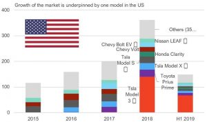 Το 2019 οι νεοεμφανισθέντες παραγωγοί αυτοκινήτων έκαναν το ντεμπούτο τους πουλώντας ηλεκτροκίνητα αυτοκίνητα τα οποία μονοπώλησαν σχεδόν το αγοραστικό ενδιαφέρον στον τομέα αυτόν. Η Tesla θαυματούργησε και πάλι, θεμελιώνοντας την ανάκαμψή της στην αμερικάνικη αλλά και την ευρωπαϊκή αγορά, με την κατασκευή αυτοκινήτων που οι άλλοι απλά δεν διαθέτουν ακόμα (βλέπε διάγραμμα).