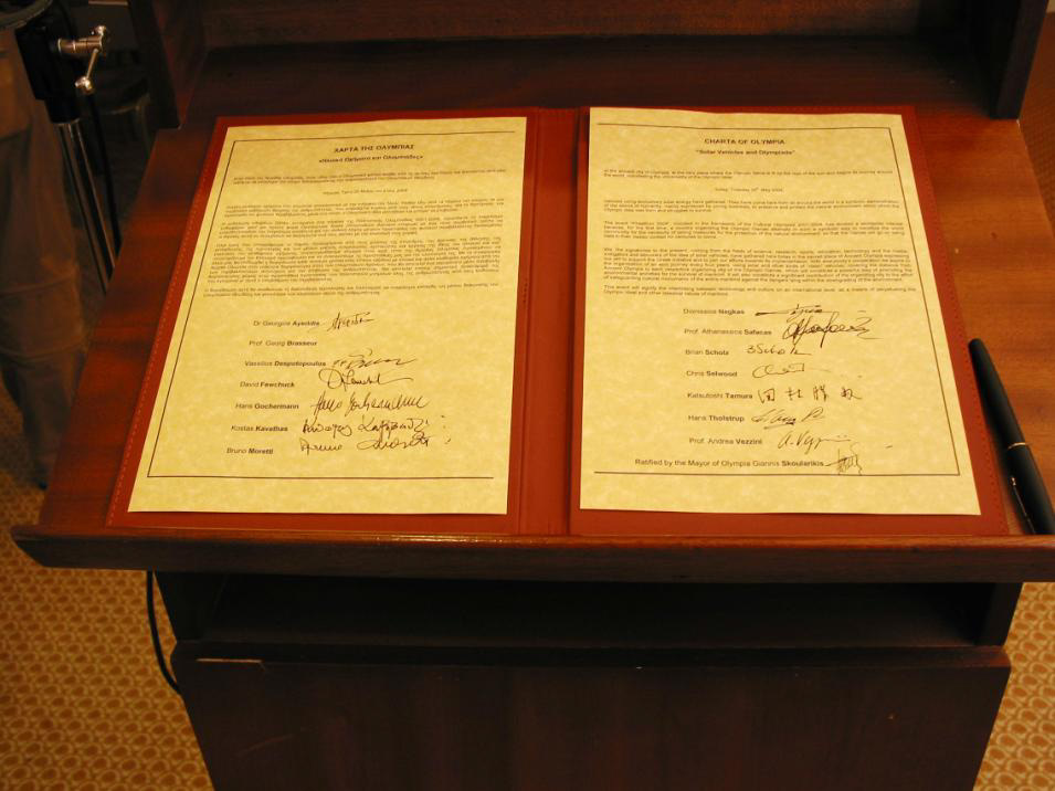 Όσοι από τον εκπαιδευτικό/τεχνολογικό χώρο έχουν ασχοληθεί με την ερευνητική πρόκληση της κατασκευής οχήματος που να κινείται αποκλειστικά με την ηλιακή ενέργεια γνωρίζουν ότι, σε παγκόσμιο επίπεδο, επικρατούν σήμερα τα ηλιακά οχήματα τύπου «Olympia Class». Λίγοι όμως γνωρίζουν ότι αυτά τα οχήματα ονομάστηκαν έτσι γιατί οι τεχνικές τους προδιαγραφές αποτέλεσαν εργασία και πρόταση της Ελλάδας προς τους διεθνείς φορείς του συγκεκριμένου χώρου, της οποίας η αποδοχή συμφωνήθηκε με έγγραφο που υπογράφτηκε το 2004 σε επίσημη τελετή στο Δημαρχείο της Αρχαίας Ολυμπίας.