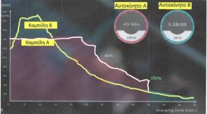 Συγκριτικό διάγραμμα καμπυλών φόρτισης δύο ηλεκτρικών αυτοκινήτων με την ίδια χωρητικότητα συσσωρευτών. Το αυτοκίνητο Α από πλήρως εκφορτισμένο φτάνει το 100 % της φόρτισης εντός 45 λεπτών με ταχυφορτιστή 140 kW. Το αυτοκίνητο Β χρειάζεται για το 99% περίπου 1ω και 28λ, παρά το ότι άρχισε τη φόρτιση με μέγιστη ισχύ 200 kW.